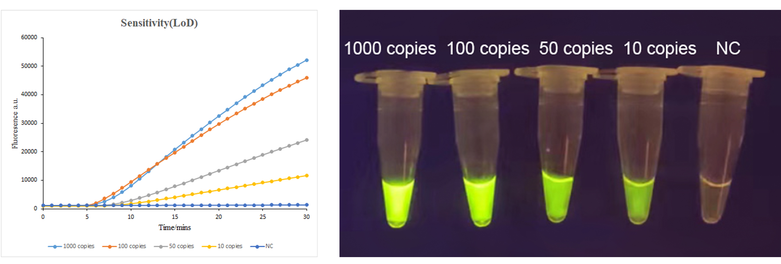 使用ASFV 1070检测非洲猪瘟病毒,CRISPR/Cas12a一管法检测技术可在10min内检测到100 copies的核酸;可在20min内检测到10-50 copies的核酸。